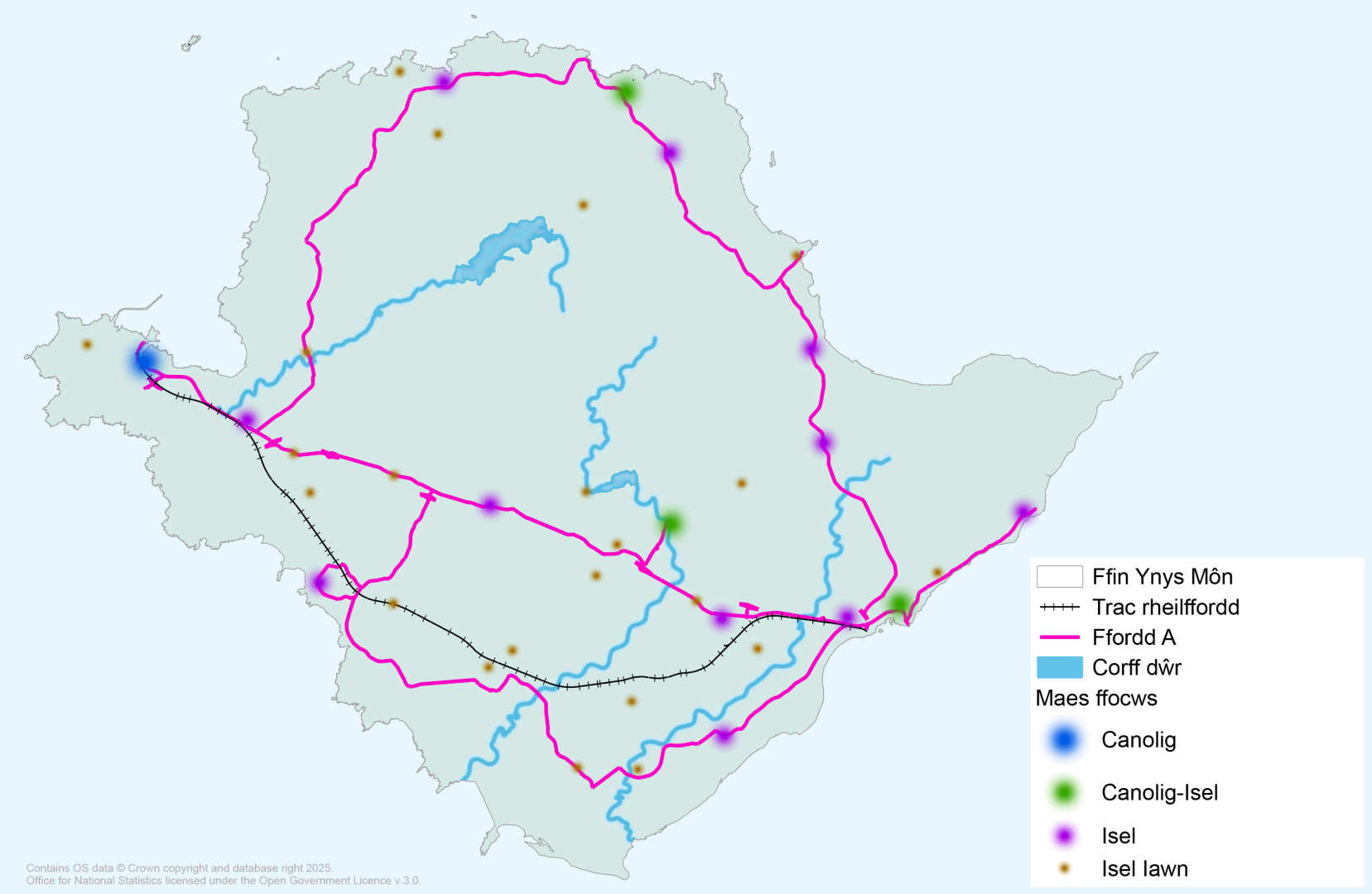 9.1.1 Byddai Opsiwn A yn canolbwyntio'r datblygu ar aneddiadau allweddol sylfaenol (canolfannau gwasanaethau is-ranbarthol a chanolfannau gwasanaethau trefol) Caergybi, Llangefni, Amlwch a Phorthaethwy. Mae'n barhad cyffredinol o'r strategaeth ofodol bresennol a nodir yn y CDLlC presennol. Fodd bynnag, mae dosbarthiadau rhai aneddiadau wedi newid o ganlyniad i'r Astudiaeth Aneddiadau wedi'i diweddaru. Mae Caergybi wedi cael ei hail-ddosbarthu'n ganolfan Is-ranbarthol ac mae Porthaethwy wedi cael ei huwchraddio o Ganolfan Gwasanaethau Lleol i Ganolfan Gwasanaethau Trefol.